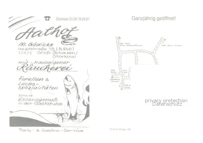 Storkow_Mark Aalhof Raeucherei Gaststube Terrasse Storkow Mark postalisch nicht gelaufen nach 1965 Werbekarte (keine Postkarte) Erhaltung siehe scans [FriedD77] Werbekarte (keine Postkarte) Frierer