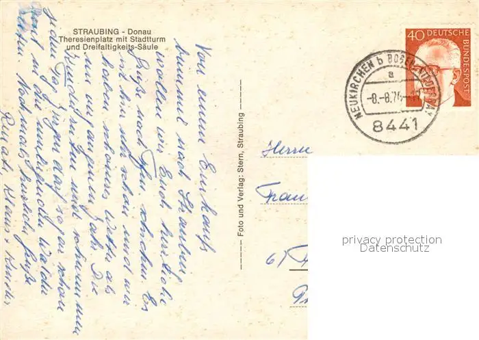 Straubing Theresienplatz Stadtturm Dreifaltigkeitssaeule Straubing postalisch gelaufen 1976 Erhaltung siehe scans [FriedD77] Frierer