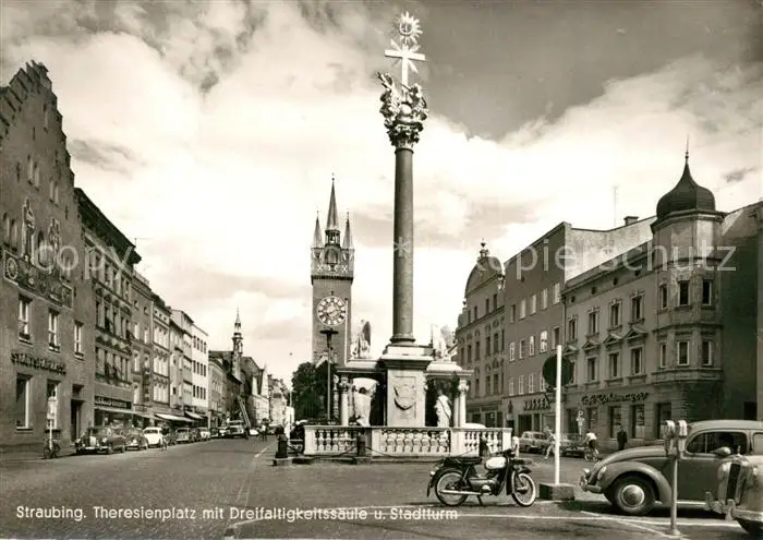 AK / Ansichtskarte Straubing Theresienplatz mit Dreifaltigkeistss?ule und Stadtturm Straubing