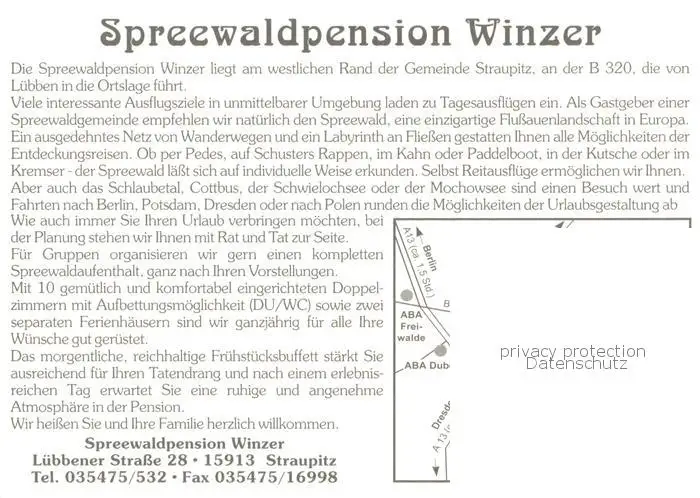 Straupitz Spreewaldpension Winzer Straupitz postalisch nicht gelaufen nach 1965 Werbekarte (keine Postkarte) Erhaltung siehe scans [FriedD77] Werbekarte (keine Postkarte) Frierer