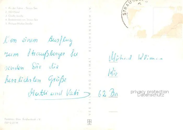 Strausberg_Brandenburg Faehre Strausssee HO Hotel Grosse Strasse Badeanstalt Philipp Mueller Strasse Strausberg Brandenburg postalisch gelaufen 1969 Erhaltung siehe scans [FriedD77] Frierer
