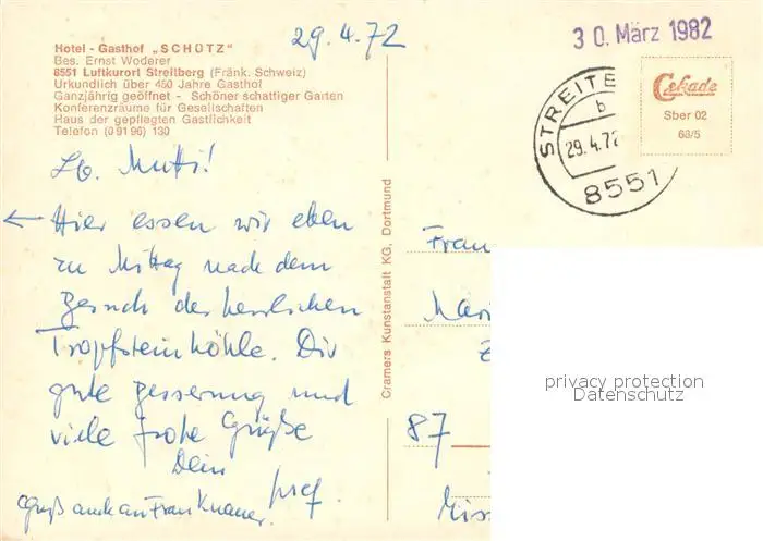 Streitberg_Oberfranken Hotel Gasthof Schuetz Streitberg Oberfranken postalisch gelaufen 1972 Erhaltung siehe scans [WerneD78] WernPID7