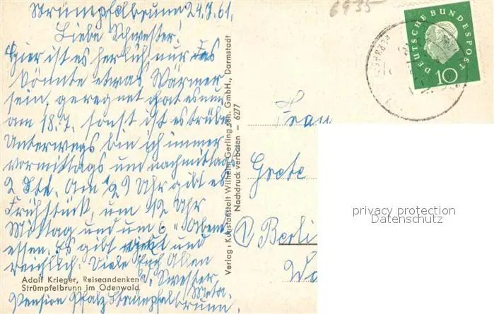 Struempfelbrunn Panorama Eberbach Gaimuehle Odenwald Schloss Zwingenberg Wolfsschlucht Aussichtsturm Katzenbuckel Struempfelbrunn postalisch gelaufen 1961 Erhaltung siehe scans [FriedD77] Frierer