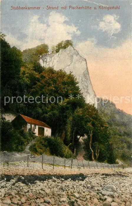 AK / Ansichtskarte Stubbenkammer_Ruegen Strand mit Fischerhuette und Koenigsstuhl Stubbenkammer Ruegen