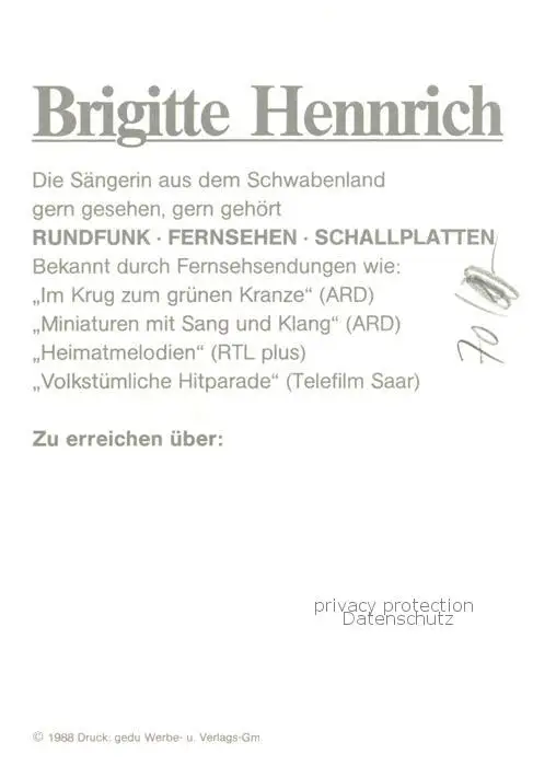 Stuttgart Brigitte Hennrich Saengerin Stuttgart postalisch nicht gelaufen nach 1965 Erhaltung siehe scans [WerneD78] WernPID7