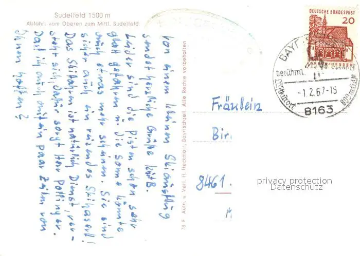 Sudelfeld Abfahrt vom Oberen zum Mittleren Sudelfeld Wintersportplatz Bayerische Alpen Sudelfeld postalisch gelaufen 1967 Erhaltung siehe scans [FriedD77] Frierer