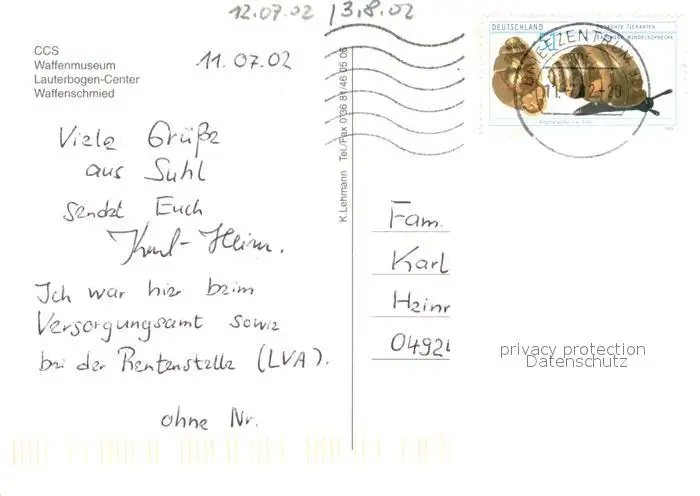 Suhl_Thueringer_Wald CCS Waffenmuseum Lauterbogen Center Waffenschmied See Suhl_Thueringer_Wald postalisch gelaufen 2002 Erhaltung siehe scans [FriedD77] Frierer