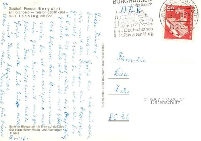 Taching_See Gasthof zum Bergwirt Terrasse Panorama Kirche Taching See postalisch gelaufen 1986 Erhaltung siehe scans [WerneD78] WernPID7