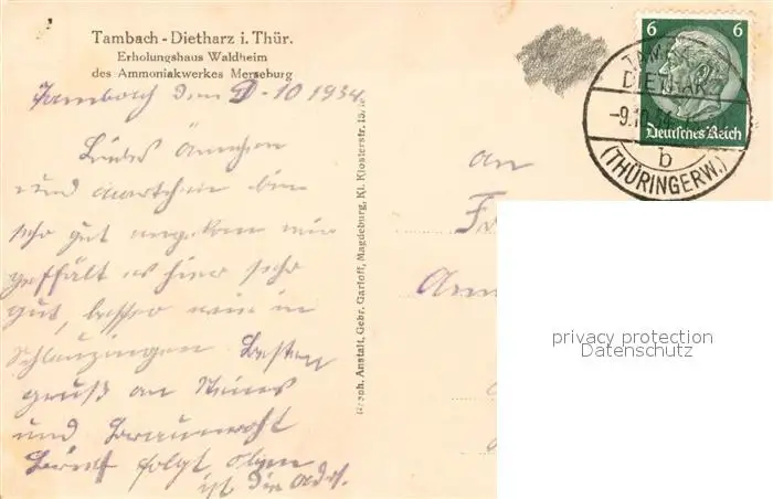 Tambach-Dietharz Erholungsheim Waldheim Ammoniakwerk Merseburg Tambach-Dietharz postalisch gelaufen 1934 Erhaltung siehe scans [KathaD81] Kathoren