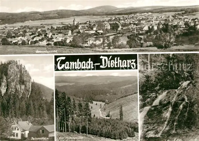 AK / Ansichtskarte Tambach Dietharz Gesamtansicht Falkenstein Felsen Landschaftspanorama Mittelwasser Wasserfall Spitterfall Tambach Dietharz