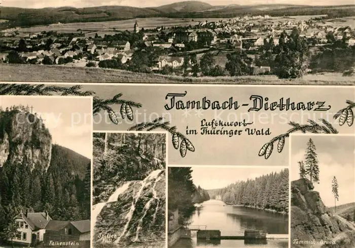 Tambach-Dietharz Gesamtansicht Falkenstein Wasserfall Tammichgrund Landschaftspanorama Tambach-Dietharz postalisch gelaufen 1959 Erhaltung siehe scans [FriedD77] Frierer