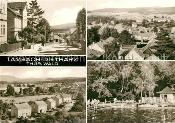 AK / Ansichtskarte Tambach Dietharz Leninstrasse Kirchturmblick Grosser Buchenberg Schwimmbad Tambach Dietharz