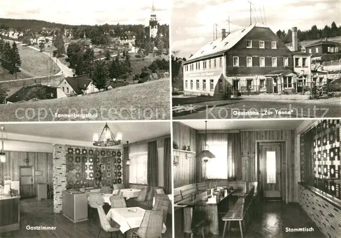 Tannenbergsthal_Vogtland Ortsansicht mit Kirche Gaststaette Zur Tanne Gastzimmer Stammtisch Tannenbergsthal_Vogtland postalisch nicht gelaufen 1973 Erhaltung siehe scans [FriedD77] Frierer