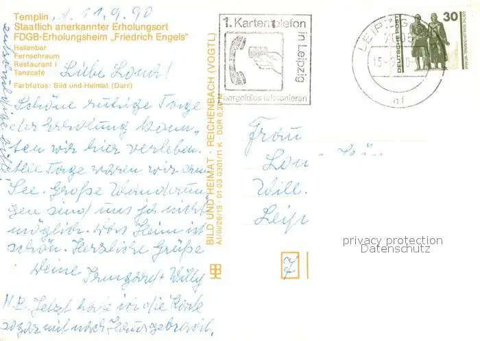 Templin FDGB Erholungsheim Friedrich Engels Hallenbar Fernsehraum Restaurant I Tanzcafe Templin postalisch gelaufen 1990 Erhaltung siehe scans [WerneD78] WernPID7