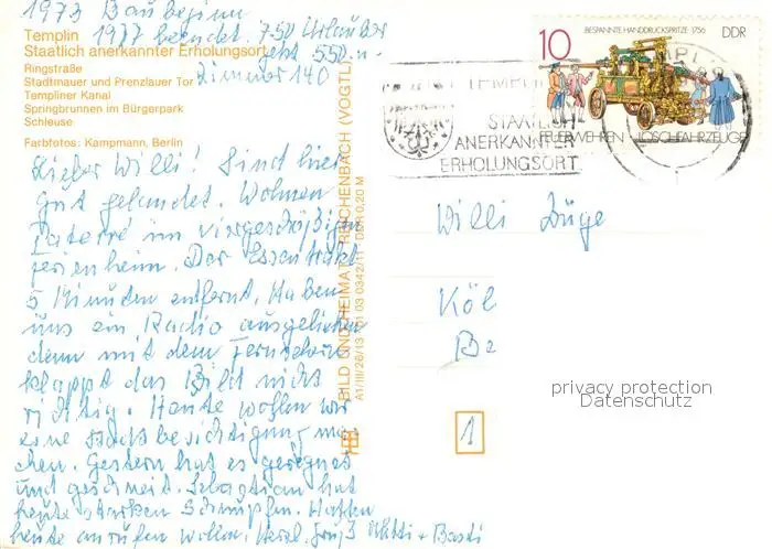 Templin Ringstrasse Wohnsiedlung Stadtmauer Prenzlauer Tor Templiner Kanal Springbrunnen Buergerpark Schleuse Templin postalisch gelaufen 1988 Erhaltung siehe scans [FriedD77] Frierer
