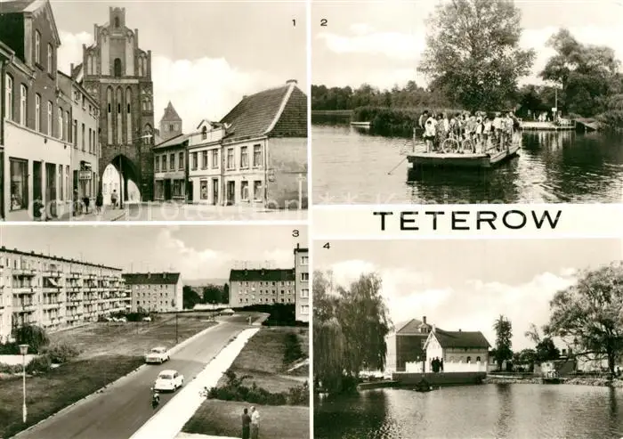 AK / Ansichtskarte Teterow_Mecklenburg_Vorpommern Rostocker Tor Faehre Burgwallinsel Johannes Becher Strasse Muehlenteich Teterow_Mecklenburg