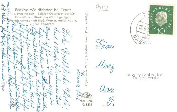 Teunz Pension Waldfrieden Teunz postalisch gelaufen 1959 Erhaltung siehe scans [FriedD77] Frierer