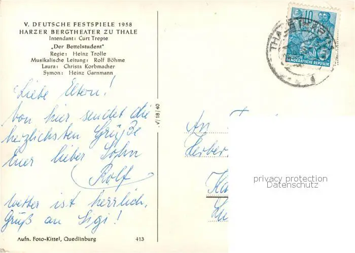 Thale_Harz Dt Festspiele Harzer Bergtheater Der Bettelstudent Thale_Harz postalisch gelaufen 1921-1965 Erhaltung siehe scans [WerneD78] WernPID7