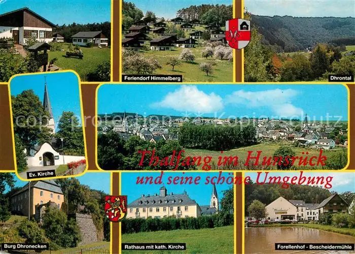 Thalfang Feriendorf Himmelberg Dhrontal Ev Kirche Panorama Burg Dhronecken Rathaus mit kath Kirche Forellenhof Bescheidermuehle Thalfang postalisch gelaufen nach 1965 Erhaltung siehe scans [WerneD78] WernPID7