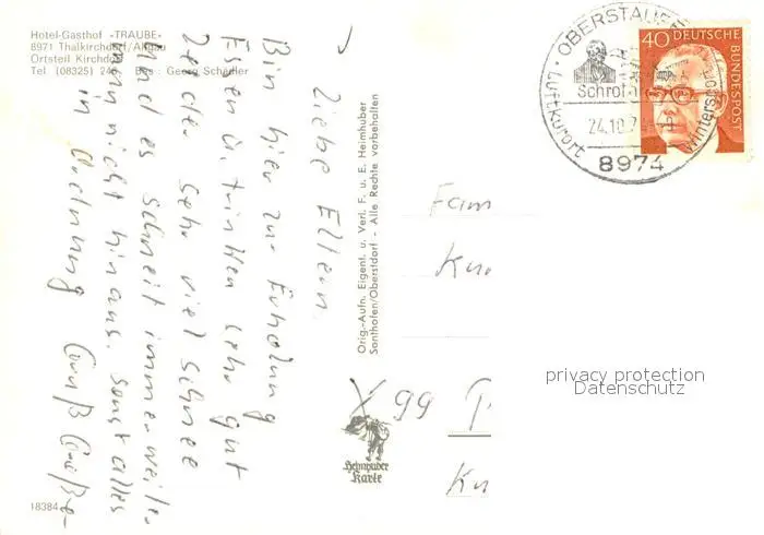 Thalkirchdorf Hotel Gasthof Traube Speisesaal Einkehrstube Zirbelstube Thalkirchdorf postalisch gelaufen 1974 Erhaltung siehe scans [WerneD78] WernPID7