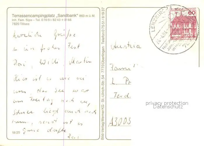 Titisee Campingplatz Sandbank Restaurant Uferpartie am See Panorama Schwarzwald Fliegeraufnahme Titisee postalisch gelaufen 1984 Erhaltung siehe scans [FriedD77] Frierer