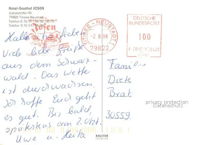 Titisee-Neustadt Hotel Gasthof Josen Restaurant Hallenbad Titisee-Neustadt postalisch gelaufen 1998 Erhaltung siehe scans [FriedD77] Frierer