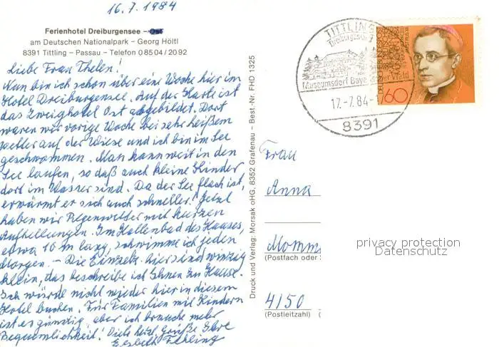 Tittling Ferienhotel Dreiburgensee am Deutschen Nationalpark Tittling postalisch gelaufen 1984 Erhaltung siehe scans [FriedD77] Frierer