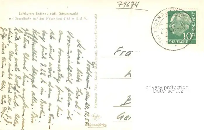 Todtnau Luftkurort im Schwarzwald Sesselbahn auf das Hasenhorn Todtnau postalisch gelaufen 1955 Erhaltung siehe scans [FriedD77] Frierer