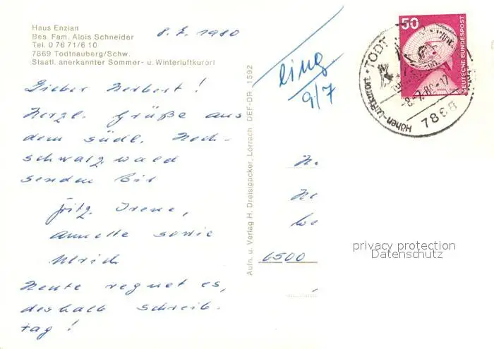 Todtnauberg Gaestehaus Pension Haus Enzian Freibad Wintersportplatz Schwarzwald Wasserfall Todtnauberg postalisch gelaufen 1980 Erhaltung siehe scans [FriedD77] Frierer