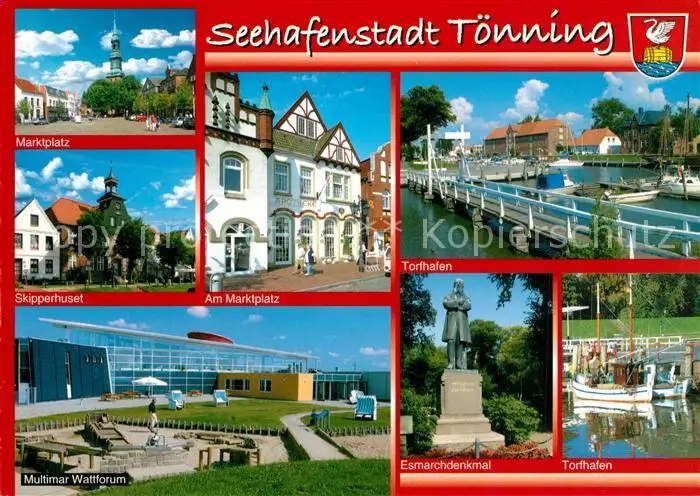 AK / Ansichtskarte Toenning_Nordseebad Marktplatz Skipperhuset Torfhafen Esmarchdenkmal Multimar Wattforum Toenning_Nordseebad