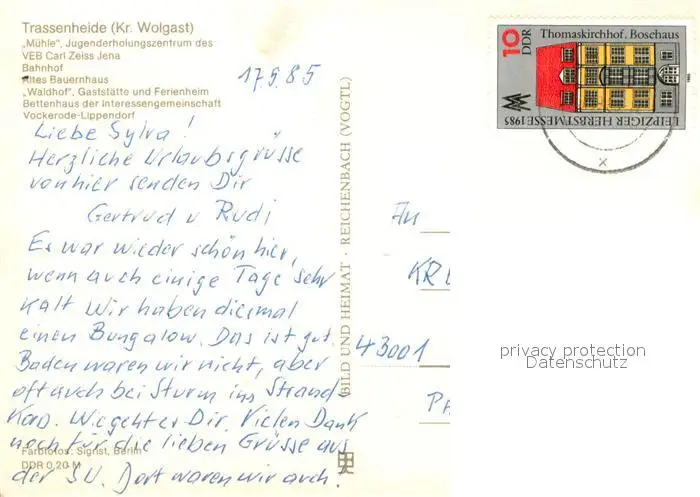 Trassenheide_Usedom Muehle Jugenderholungszentrum des VEB Carl Zeiss Jena Bahnhof Altes Bauernhauus Waldhof Gaststaette Ferienheim Bettenhaus Trassenheide Usedom postalisch gelaufen 1985 Erhaltung siehe scans [FriedD77] Frierer