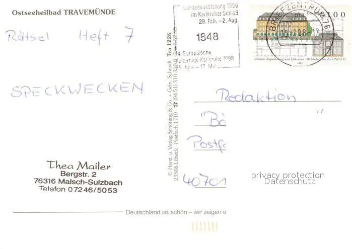 Travemuende_Ostseebad Fachwerkhaeuser Travemuende_Ostseebad postalisch gelaufen 1998 Erhaltung siehe scans [KathaD81] Kathoren