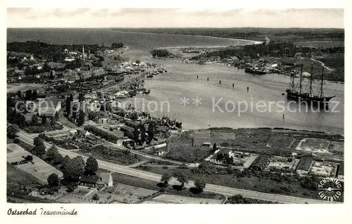 Travemuende_Ostseebad Kategorie Alte Ansichtskarten Postkarten bx62259 Travemuende_Ostseebad Fliegeraufnahme Hafen Dreimaster Travemuende_Ostseebad postalisch nicht gelaufen nach 1965 Erhaltung siehe scans [KathaD81]