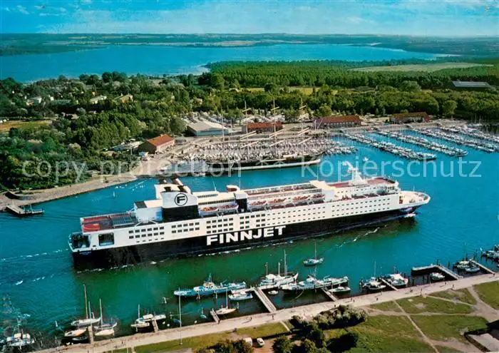 AK / Ansichtskarte Travemuende_Ostseebad Fliegeraufnahme mit Passagierschiff Finnjet beim Einlaufen in den Hafen mit Segelschiff Passat Travemuende_Ostseebad