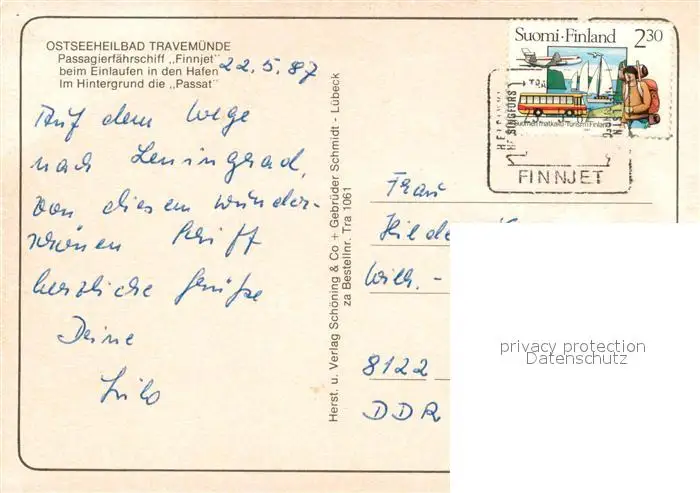 Travemuende_Ostseebad Fliegeraufnahme mit Passagierschiff Finnjet beim Einlaufen in den Hafen mit Segelschiff Passat Travemuende_Ostseebad postalisch gelaufen 1987 Erhaltung siehe scans [WerneD78] WernPID7