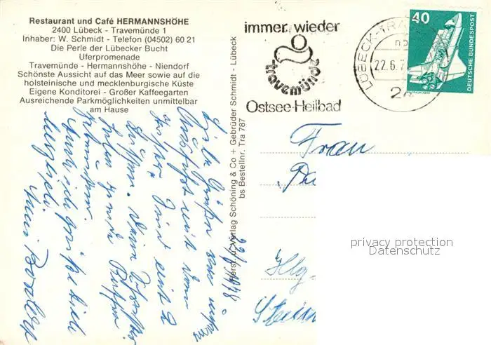 Travemuende_Ostseebad Restaurant Cafe Hermannshoehe Meerblick Fliegeraufnahme Travemuende_Ostseebad postalisch gelaufen 1978 Erhaltung siehe scans [FriedD77] Frierer