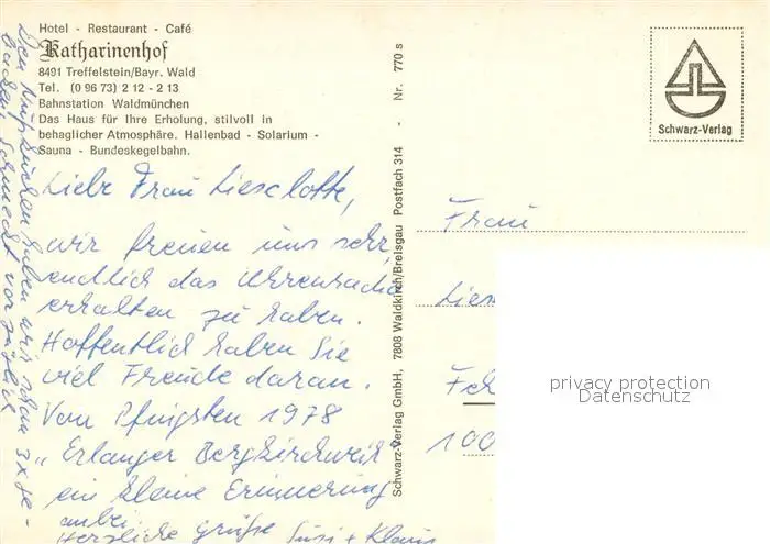 Treffelstein Hotel Restaurant Cafe Katharinenhof Treffelstein postalisch nicht gelaufen nach 1965 Erhaltung siehe scans [WerneD78] WernPID7