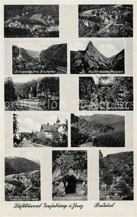 Treseburg_Harz Eingang ins Bodetal Rosstrappenfelsen Kirche Teufelsbruecke Weisser Hirsch Wilhelmsblick Gasthaus zur Lappbode Treseburg Harz postalisch nicht gelaufen 1921-1965 Erhaltung siehe scans [WerneD78] WernPID7