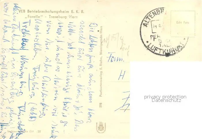Treseburg_Harz VEB Betriebserholungsheim Forelle Treseburg Harz postalisch gelaufen 1958 Erhaltung siehe scans [FriedD77] Frierer