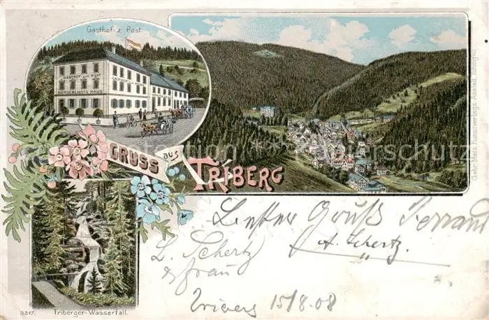 Triberg Gesamtansicht m. Gasthof z. Post u. Triberger Wasserfall Triberg postalisch gelaufen 1908 Erhaltung siehe scans [LiesaD40] LiesID40