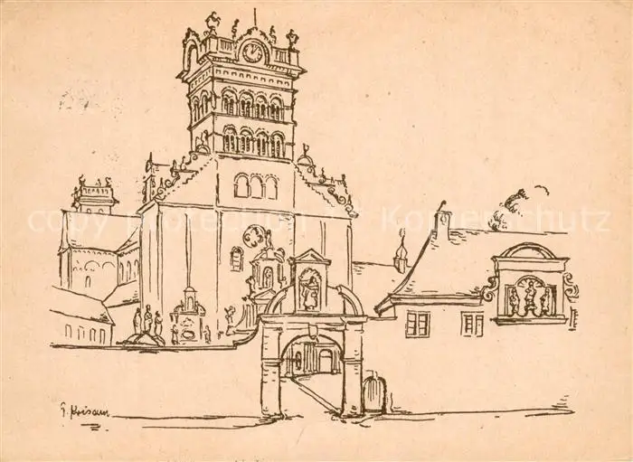 Trier 800jaehriges Weihe-Jubilaeum der St. Matthias Basilika Zeichnung Kuenstlerkarte Trier postalisch gelaufen 1948 Erhaltung siehe scans [FriedD77] Frierer