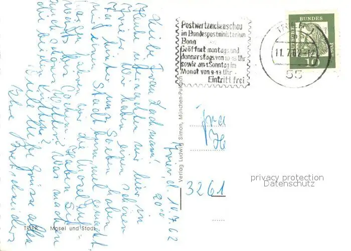 Trier Fliegeraufnahme mit Mosel und Stadt Trier postalisch gelaufen 1962 Erhaltung siehe scans [WerneD78] WernPID7