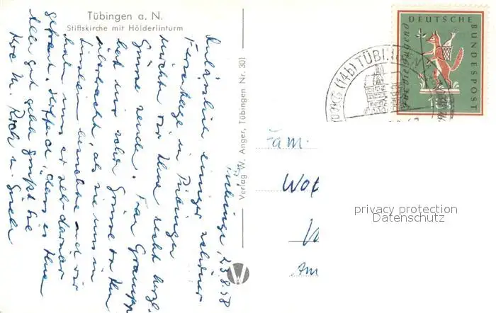 Tuebingen_Neckar Stiftskirche mit Hoelderlinturm postalisch gelaufen 1958 Erhaltung siehe scans [WerneD78] WernPID7