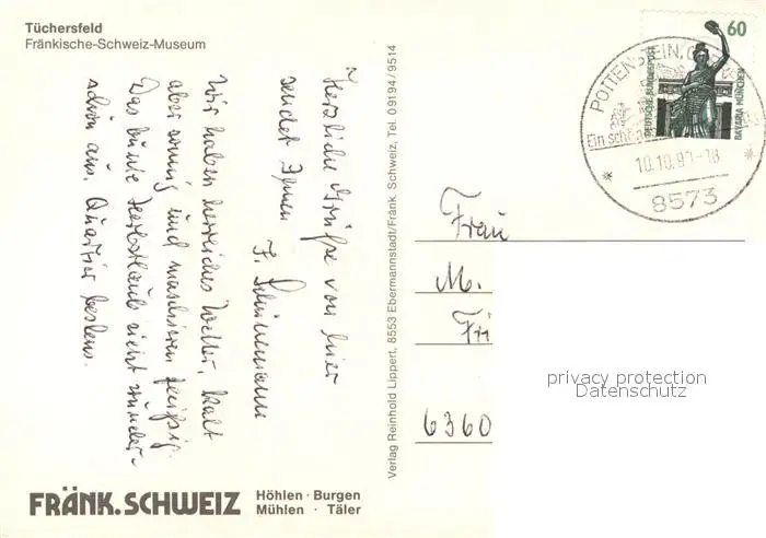 Tuechersfeld Fraenkische Schweiz Museum Felsen Tuechersfeld postalisch gelaufen 1990 Erhaltung siehe scans [FriedD77] Frierer