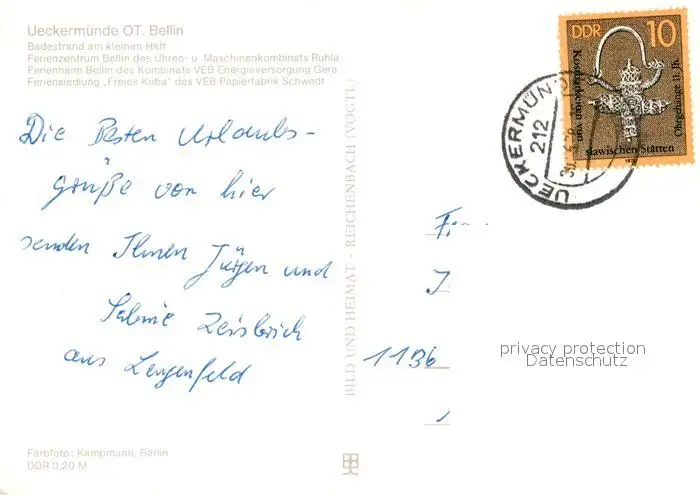Ueckermuende_Mecklenburg_Vorpommern Badestrand am kleinen Haff Ferienzentrum Bellin Feriensiedlung Freies Kuba Bungalows Ueckermuende_Mecklenburg postalisch gelaufen 1978 Erhaltung siehe scans [FriedD77] Frierer