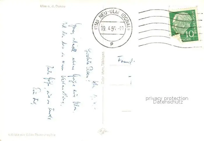 Ulm_Donau Blick ueber die Donau zur Altstadt mit Ulmer Muenster Ulm_Donau postalisch gelaufen 1956 Erhaltung siehe scans [FriedD77] Frierer
