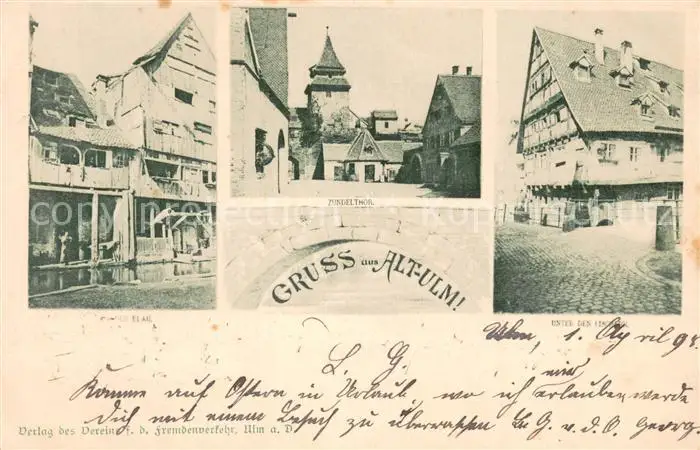 Ulm__Donau Alt-Ulm Haeuserpartie an der Blau Zundeltor Unter den Fischern postalisch nicht gelaufen 1898 Erhaltung siehe scans [FriedD77] Frierer