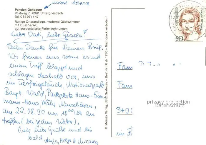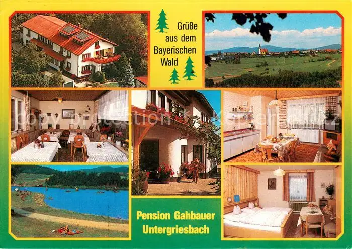 Untergriesbach_Niederbayern Pension Gahbauer Gastraum Fremdenzimmer Landschaftspanorama See Untergriesbach postalisch gelaufen 1990 Erhaltung siehe scans [FriedD77] Frierer