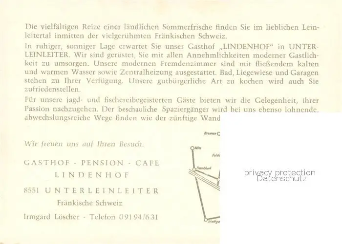 Unterleinleiter Cafe Pension Lindenhof Gartenterrasse Panorama Gastraum Unterleinleiter postalisch nicht gelaufen nach 1965 Werbekarte (keine Postkarte) Erhaltung siehe scans [FriedD77] Werbekarte (keine Postkarte) Frierer