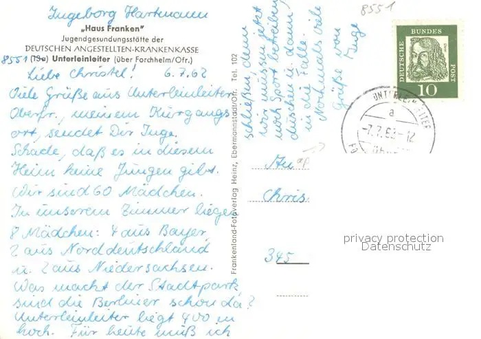 Unterleinleiter Kategorie Alte Ansichtskarten Postkarten bx93998 Unterleinleiter Haus Franken Jugendgesundungsstaette der DAK Unterleinleiter postalisch gelaufen 1963 Erhaltung siehe scans [WerneD78]